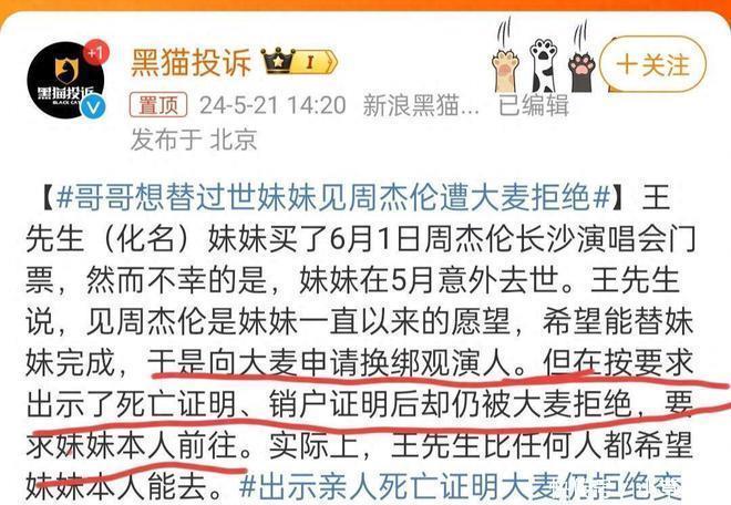 一位哥哥因为妹妹恶运死一火,无法进入已购票的周杰伦演唱会,但愿概况代替妹妹前去。他按照大麦网的条目,提供了悉数必要的解说和手续,但愿概况完成票务的转,大麦网最终拒却了这一央求,情理是系统捏法不允许票务转让。