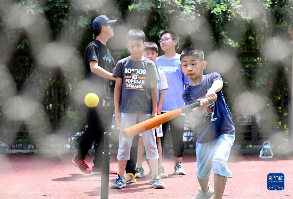 7月10日,学生在河北省石家庄市保利启新小学暑期托管班锻练软式棒垒球。