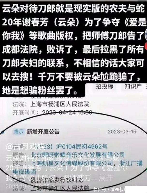 此前,有网友爆料称,刀郎曾为爱徒云朵创作过《我的楼兰》《云朵》等四首歌曲,并给了她10年的演唱权,然而云朵却在独自出来发展后,不仅跟那英签约并吞家经纪公司,还把这几首歌的版权卖给了那英姐姐那辛的公司。