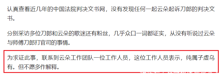 杜恩湖示意,他负责检察了近几年的中功令院判决文告网,莫得发现任何统共云朵告状刀郎的判决文告。随后他还有关到云朵团队的使命主说念主员,使命主说念主员也示意所谓的“云朵因为版权问题5次告状刀郎”一事老练子虚子虚。不外对方不肯多作念阐述。