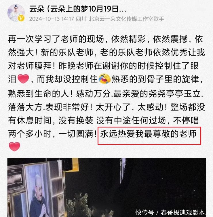 不仅如斯,在之后的云朵昆山演唱会上,云朵更是径直喊话刀郎,称我方始终是刀郎的门徒,对师傅师娘始终感德。