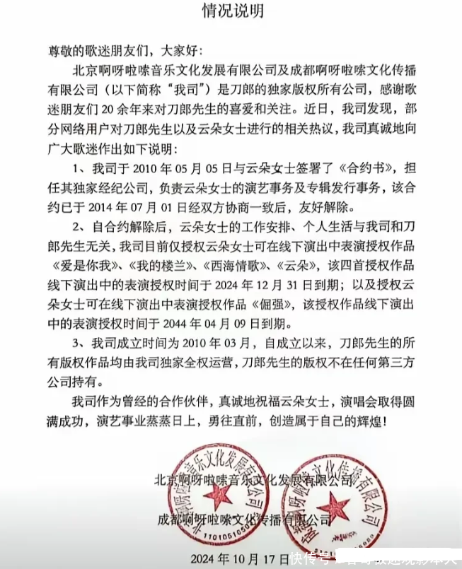 其实云朵和刀郎之间到底若何了?刀郎版权公司的那篇声明也骄横了一二,两边早在十年前就解约了,那四首歌的授权也将在本年年底到期,届时云朵就不可再无间演唱这些歌曲。