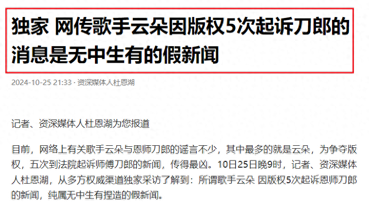 2024欧洲杯足球博彩有走地网站吗10月25日晚,资深媒体东说念主、记者杜恩湖发文,称“所谓歌手云朵因版权5次告状恩师刀郎的新闻,老练系风捕景抓造的假新闻。”